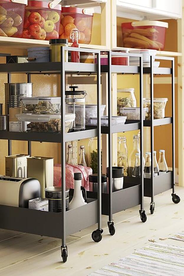 En primer lugar hay que hacer un ejercicio de racionalización y optimización del espacio. Hacer limpieza, tirar los productos caducados y poner más a mano aquellos que más utilizamos. Si una vez hecho este proceso seguimos necesitando más espacio podemos ampliar con otros armarios, cajones de menaje que podamos reubicar... o podemos añadir pequeños elementos que 'desahoguen' como por ejemplo, los carritos (con ruedas son más cómodos porque así podemos moverlos de sitio más fácilmente en caso de que lo necesitemos).
