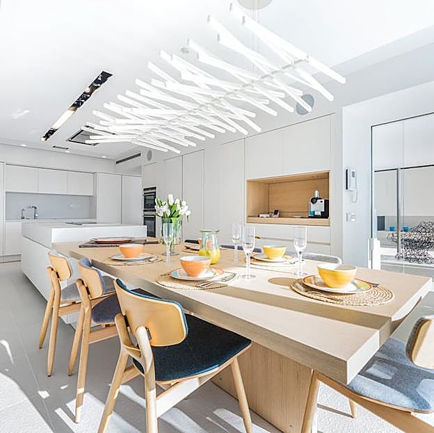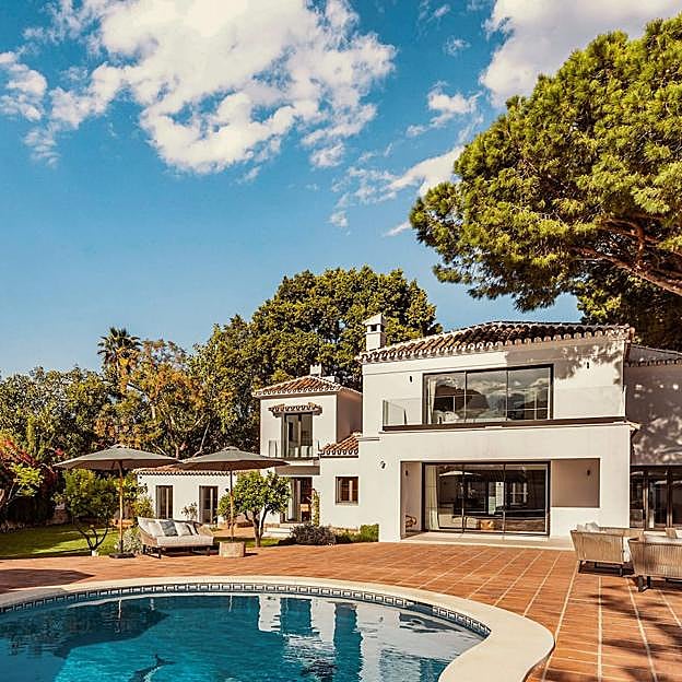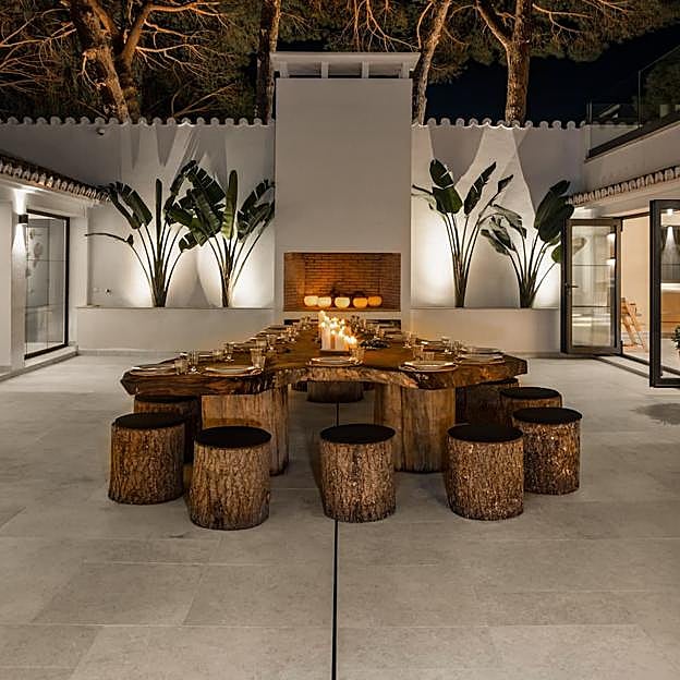 Esta villa de lujo en Marbella es otra de las más lujosas de nuestro país. Cuenta con 6 dormitorios y capacidad para 12 personas. Tiene multitud de espacios abiertos, entre los que se encuentra un enorme patio interior con una espectacular mesa de comedor de madera.