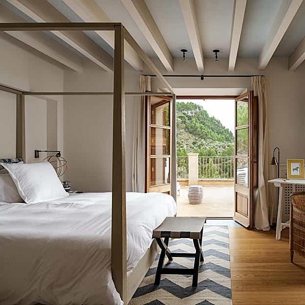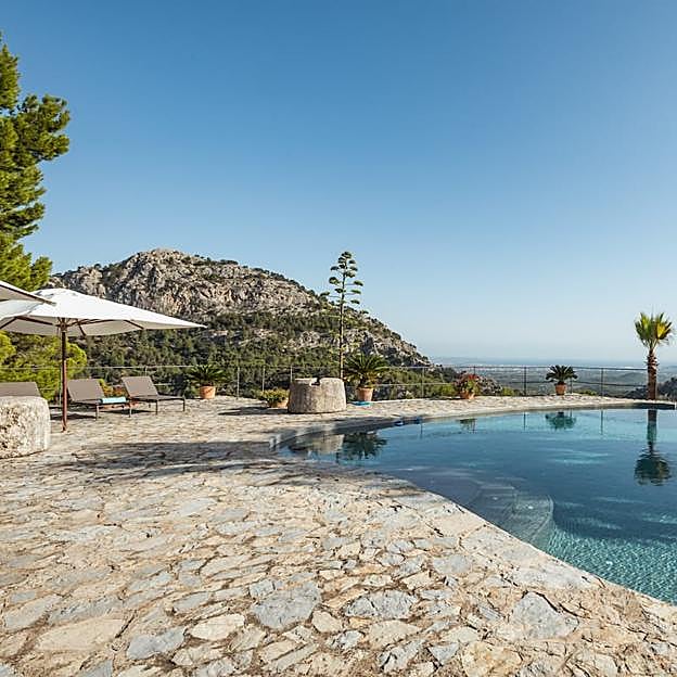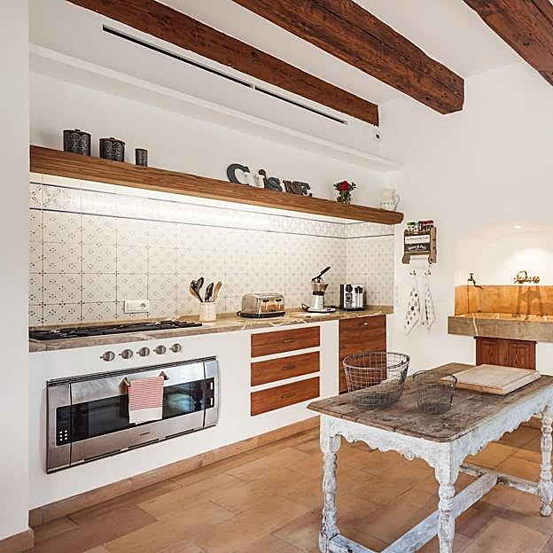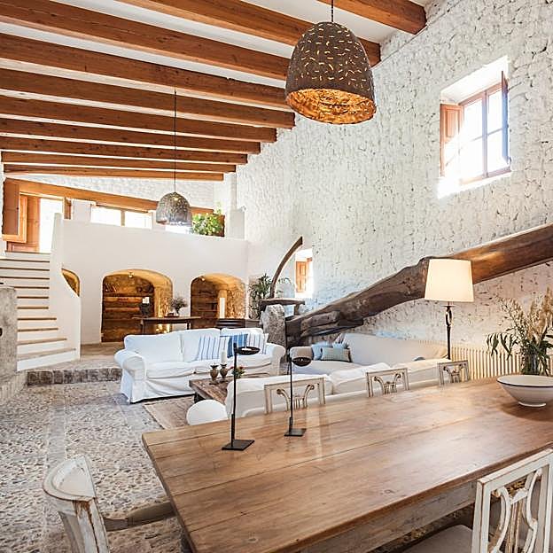 En la sierra de la Tramuntana se encuentra esta espectacular casa con aires mediterráneos. Paredes de ladrillos (como en el exterior), grandes vigas de madera, piezas artesanales alrededor de las estancias, y una cocina rústica con mucho encanto.