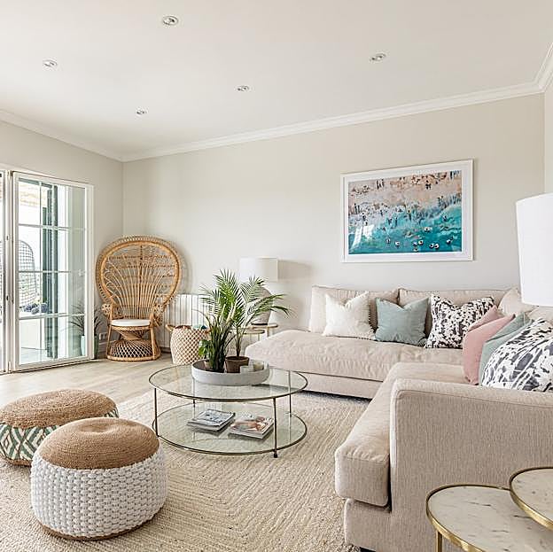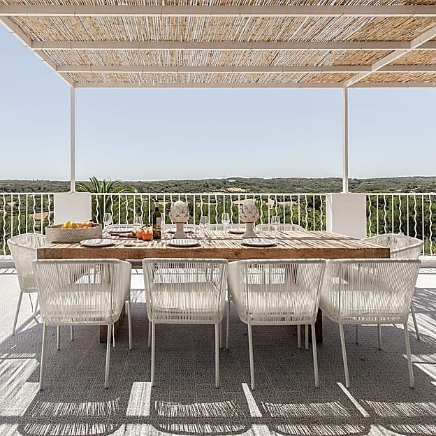 Esta espectacular mansión se encuentra en Menorca, concretamente en Mahón. Cuenta con 5 dormitorios, capacidad para 10 personas, piscina, y unas vistas de ensueño. La decoración de la casa destaca por tonos neutros, algunos toques de color en azul (como uno de los sofás principales de la casa) y muchos elementos de fibra natural.