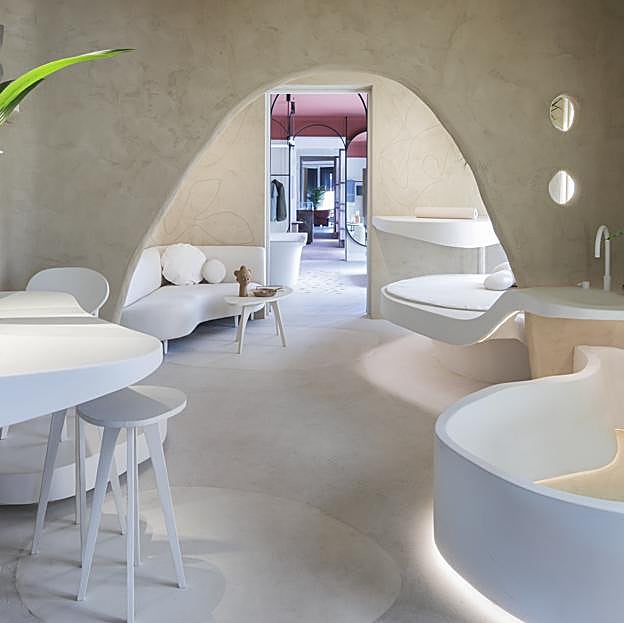 Las formas redondeadas están presentes en paredes de sinuosas ondulaciones, en muros sin aristas, arcos de medio punto, asientos curvos, mesitas circulares o de óvalos irregulares.