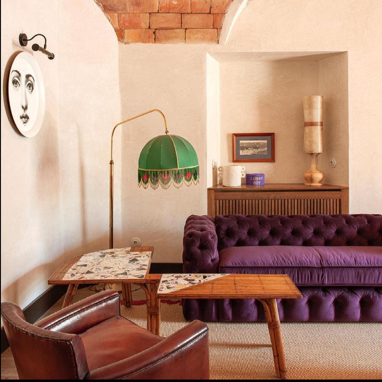 Pero las lámparas con toques vintage no son las únicas protagonistas del hotel La Bionda de Begur, también las piezas de terciopelo como este sofá en color violeta. Un sofá con mucha personalidad que contrasta con las paredes y los suelos con acabados de piedra tan antiguos. Sin duda, una idea original que ha conquistado completamente a todos los huéspedes y parte de sus seguidores en las redes sociales.