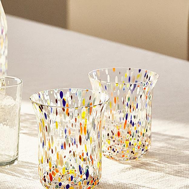 Si buscas unos vasos que sean pura diversión, entonces esta opción es para ti. Están fabricados en vidrio soplado, y la forma es ideal. Pero sin duda lo que más nos ha gustado, y lo que salta a simple vista, son las motas en todo tipo de colores (5,99 euros).