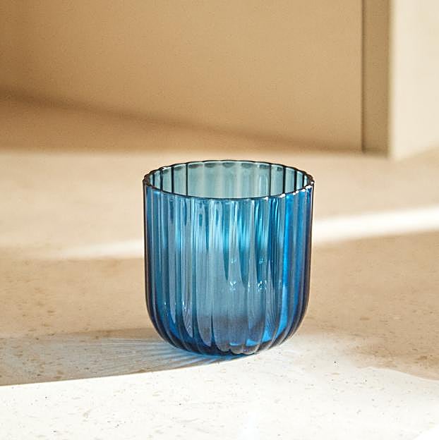 Con este diseño encontramos tanto vasos, como copas, imprescindibles también a la hora de montar una mesa. Tiene un color azul que no puede ser más bonito, y un diseño con líneas en relieve, que da el toque distintivo a la pieza (4,99 euros).