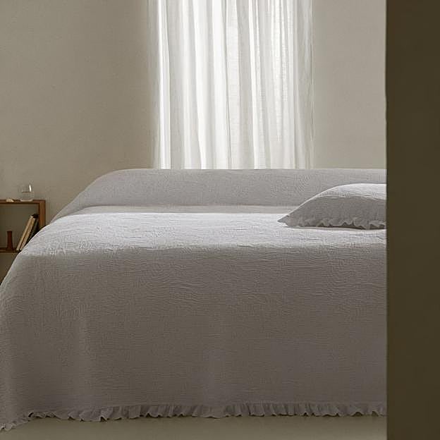 Puede que este sea nuestro gran descubrimiento dentro de esta colección, pero es que hemos caído rendidas ante esta colcha de algodón con jacquard y volantes, que es ideal (89,99 euros).