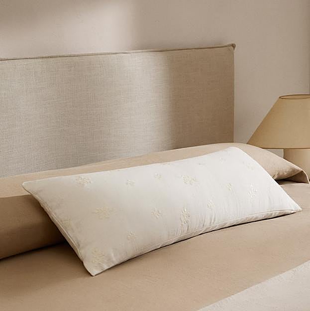 Otra alternativa de cojín, que representa esa filosofía romántica de esta nueva colección, es este en blanco con bordado de flores, que no nos puede gustar más para el dormitorio (35,99 euros).