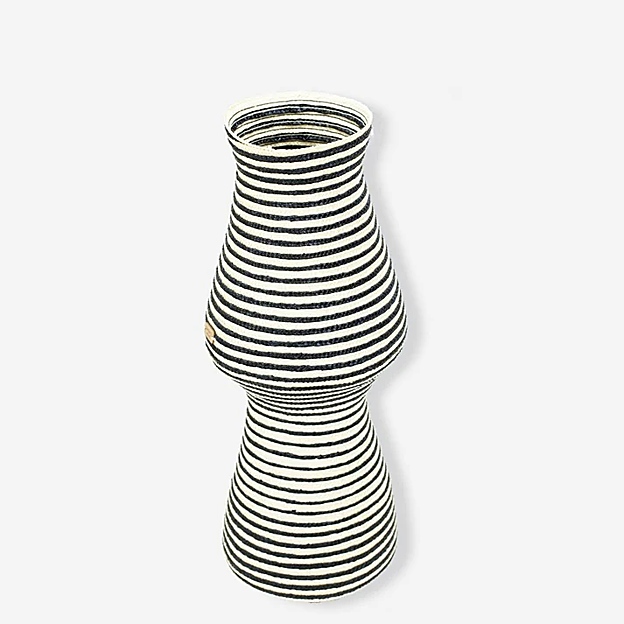 Pero, si buscas algo mucho más especial, al que ni siquiera haría falta añadirle un ramo por su originalidad, fichamos este jarrón de paja natural, moldeado a través de la técnica de alfarería y siguiendo el clásico binomio de blanco y negro. Zahati (125 euros).