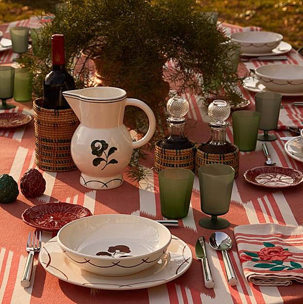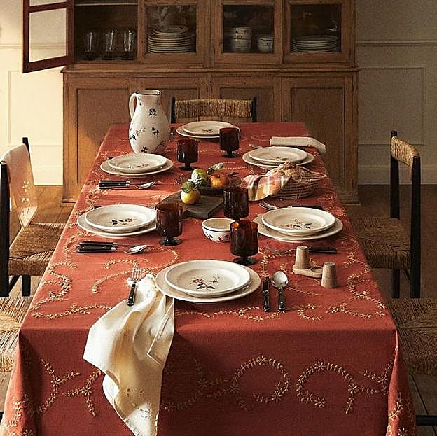 Otra opción es que la vajilla esté relegada a un segundo plano, siendo el mantel el protagonista indiscutible de la composición de la mesa. Puedes decantarte por diseños que estén llenos de colores y estampados, o una opción más sencilla, pero que también llame la atención, en algún tono diferente y bordados incluidos.