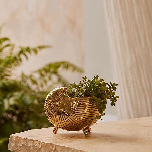 ¿Eres una amante de las plantas? Entonces este es el macetero que necesitas. Se sale por completo de los clásicos y sobrios blancos o marrones, que nada aportan a la decoración, al contrario que este dorado en forma de caracola (24,99 euros).