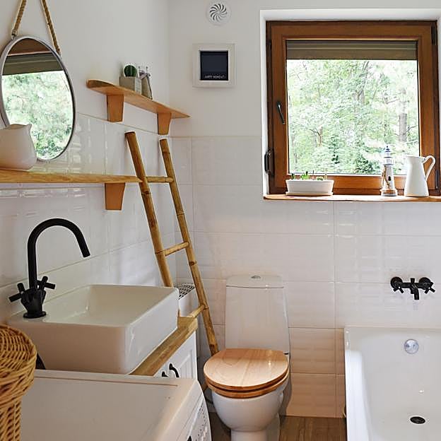 Se trata de una combinación infalibre para conseguir un baño minimalista pero acogedor a la vez. El puntito cálido lo aportan los materiales naturales, en este caso la madera que tendrá que estar tratada para soportar la humedad. Con esta combinación ganadora, conseguirás un baño de tendencia y con mucha luz.