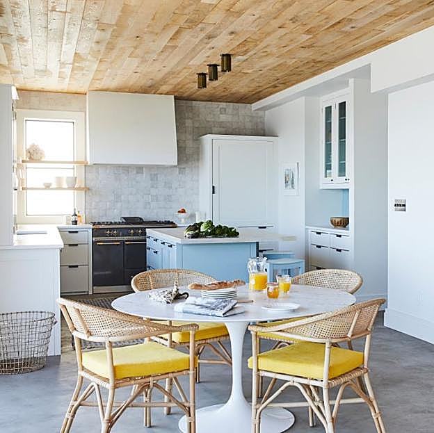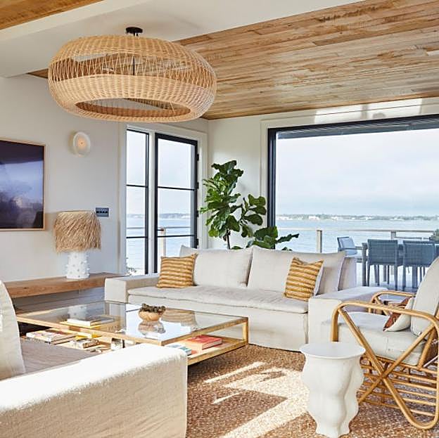 Como cuentan desde Houzz, los propietarios de esta mansión (una familia británica que veranea en los Hamptons) querían un suelo de inspiración industrial, así que «al elegir un material 'frio' para el suelo, se hacía casi imprescindible utilizar materiales cálidos para el resto del espacio. En el techo se instalaron unas tablas de madera de roble blanco recicladas«, convirtiéndose este en el material que funciona como hilo conductor en toda la casa, tanto en los muebles hechos a medida como en los detalles «creando una sensación de cohesión en toda la vivienda«. Además, se han utilizado elementos decorativos como lámparas de mesa con pantallas de paja o elementos en yute, ratán y bambú, en un juego de texturas natural que, además, aporta un toque playero.