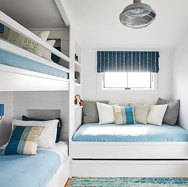 Para ganar espacio en los dormitorios y aumentar su capacidad y almacenaje (sí, la casa tiene casi 170 m2, te dijimos que el tamaño no importaba), se ha apostado por muebles funcionales y versátiles, así como literas y sofás cama. «En muchos sentidos, tuvimos que diseñar esta casa como si se tratase de un barco, aprovechando todos los rincones con estantes o bancos, como el de la ventana», cuenta en Houzz Jessica Gething, la interiorista encargada de este proyecto.