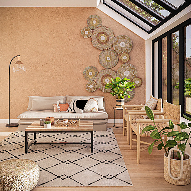 La paleta de los tierra domina este salón que respira primavera. La luz natural acentúa un espacio en el que el terracota suave de la pared se iguala con el tono de la madera natural y actúa como color predominante. El secundario sería el color piedra de la gran alfombra y el sofá; mientras que el tono acento es el negro que asoma en la perfilería de las ventanas, la estructura de las mesas auxiliares y la lámpara de pie.