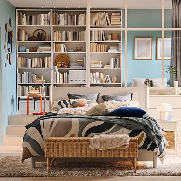 Llámalo azul bebé, celeste o empolvado, lo que está claro es que este tono suave queda a las mil maravillas al introducirlo en un detalle tan relevante como el color de las paredes y determinados adornos y textiles. Con el blanco como base, el acento del 10% en este caso llega a través de la madera natural del mimbre que da forma al banco descalzador y al cesto de la mesilla.