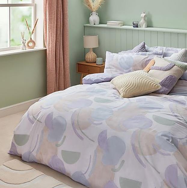 Los colores soft y candy se han adueñado de la colección deco de primavera de Primark Home. Malvas, rosas empolvados, verdes aguay amarillos vainilla son los tonos protagonistas de la temporada. Por eso, este conjunto de ropa de cama con estampado arty en una paleta pastel está a la última y pondrá una nota de tendencia 'triple B' a tu dormitorio: es de gran calidad, es precioso y está disponible desde 23 euros.