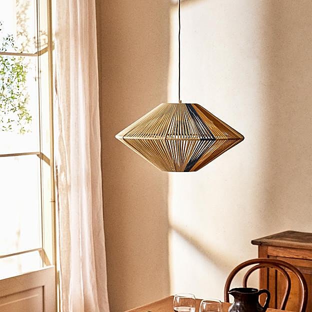 Las lámparas de techo cada vez son más habituales, con diseños arriesgados que hacen que se lleven todo el protagonismo en la decoración. Prueba de ello, y que no nos puede gustar más, es esta opción con pantalla de estructura metálica con cuerdas de algodón multicolor, y con una forma que lejos queda de los convencionalismos (119 euros).