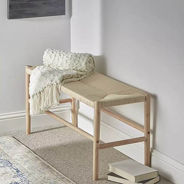 Otra alternativa de mueble para el dormitorio, es poner un banco de madera a los pies de la cama, en el que podemos colocar alguna manta o cojín, y añadir un toque extra muy elegante a la decoración (70 euros).