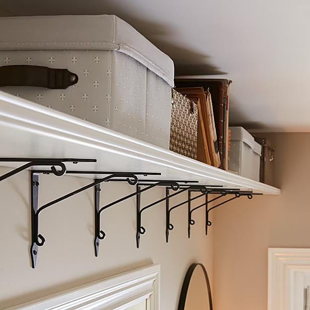 ¿Todavía necesitas más espacio? No pasa nada, siempre puedes poner un estante de pared encima de los marcos de las puertas para crear más espacio de almacenaje. En esta ocasión han escogido el estante BERGSHULT / KROKSHULT (32 euros) en color blanco y, en lugar de colocar las cosas encima sin más, han optado por meterlas en diferentes cestas y cajas, no sólo para que den un aspecto más ordenado al conjunto, sino para que no se te caiga nada en la cabeza.