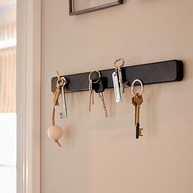 Este truco nos ha encantado. En lugar de poner los típicos ganchos para colgarlas, han colocado un portacuchillos magnético junto a la puerta para que se queden pegadas y no vuelvas a perderlas. ¿Es o no es una ideaza?