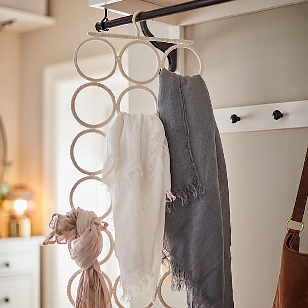 Un buen truquito para guardar los pañuelos o bufandas de toda la familia sin ocupar todo el espacio disponible es la percha múltiple KOMPLEMENT (5 euros), con capacidad para albergar 18 bufandas sin ocupar mucho espacio. El complemento ideal para los espacios pequeños.