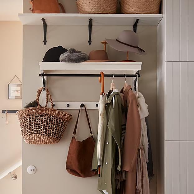 Si el zapatero no puede faltar, las perchas para colgar el abrigo, el sombrero u otros complementos también son imprescindibles en todo buen recibidor. En este caso, han optado por el perchero/estante HEMNES (50 euros), porque puedes colgar tanto la ropa en distintas perchas, como colocar sombreros u otros complementos sobre el estante. Así está todo a mano para cuando quieras volver a salir de casa.