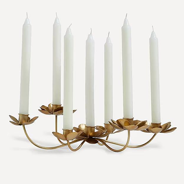 Si no estás dispuesta a colgar una lámpara de araña llena de pedreria del techo, siempre puedes optar por otra alternativa de iluminación propia de esta época, y un poco más discreta: los candelabros. Este en color dorado y forma de flores es ideal para usar también como centro de mesa. El Corte Inglés (39,95 euros).