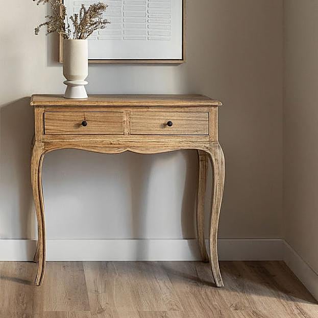 Para el recibidor de nuestra casa también hay opciones. Si no sabes cómo sacarle el máximo partido, sin tener que complicarte demasiado, este mueble está hecho para ti. Tiene una forma clásica de esta época, en madera Teresia, al que le puedes añadir desde un jarrón de flores, hasta un set de velas. Sklum (124,95 euros).