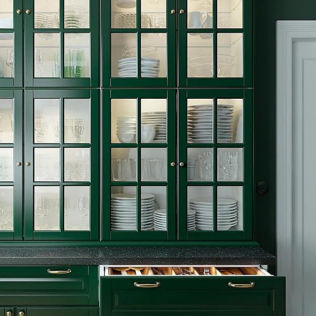 ¿Cocina en verde? Sin duda, cuando las veas querrás este otoño una igual. El verde es uno de los colores de moda, y también inundará esta temporada las cocinas. Así los hemos comprobado con esta cocina tan original y llena de personalidad de IKEA. Una cocina en verde oscuro, pero llena de vida gracias a pequeños detalles como el frontal en color blanco o los accesorios en dorado. ¿Te animarías a copiarla?