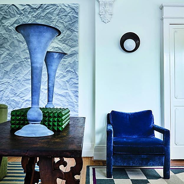 La interiorista australiana Tamsin Johnson es famosa por crear espacios a la vez frescos y sofisticados, cómodos y elegantes. En la imagen, unos jarrones de los años 30, un cuadro de Sean Wadey, un sillón de terciopelo y una alfombra vintage de Emilio Pucci ofrecen cuatro versiones diferentes del color azul.