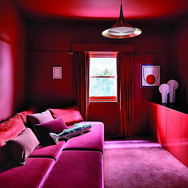 Cada vez más casas disponen de media rooms, cuartos lúdicos en los que disfrutar de las películas como si de un cine se tratara. La mayoría lo resuelve con un negro uniforme, pero la firma Doherty Design Studio arriesgó (y acertó) jugando con el espectro de los rosados en las paredes, las cortinas, la carpintería y los aterciopelados cojines, respaldos y asientos del sofá.