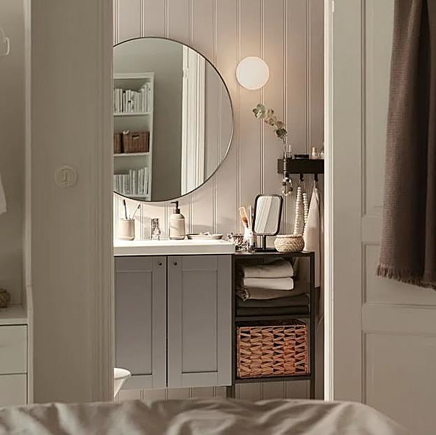 La luz es otro de los aspectos clave para crear sensación de amplitud. Si puede ser natural a través de una ventana o claraboya, perfecto, pero si no, puedes jugar con la iluminación artificial: puntos de luz directa y blanca en la zona del espejo para poder llevar a cabo tu ritual beauty de forma adecuada, y una iluminación de techo más cálida, para los momentos de relax. Además, no te olvides de jugar con los espejos, un elemento de decoración fundamental porque, además de su funcionalidad, reflejan esa luz, multiplican el campo visual y amplían los espacios de forma automática.