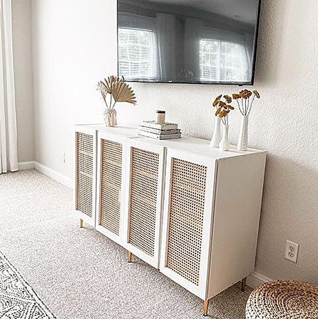 Además de añadirle patas, lo que convierte la estantería en un mueble, la clave de esta transformación está en las puertas que añade a la Kallax, que la hacen absolutamente irreconocible. Unos listones de madera y una tela de rafia como cobertura (además de unas visagras, claro) serán suficientes para crear esas puertas.