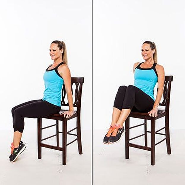 Sentada en una silla y con la columna recta, apoya las manos en el asiento y comienza a hacer elevaciones de rodilla y vuelve a la posición inicial. Repite este ejercicio 20 veces y descansa 1 minuto entre cada serie.