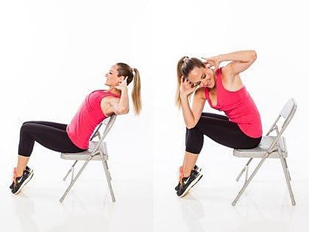 Sentada en la silla, coloca los brazos sobre la cabeza, eleva una rodilla y tócala con el codo contrario. Realiza el ejercicio 20 veces y descansa un minuto antes de volver a repetir.