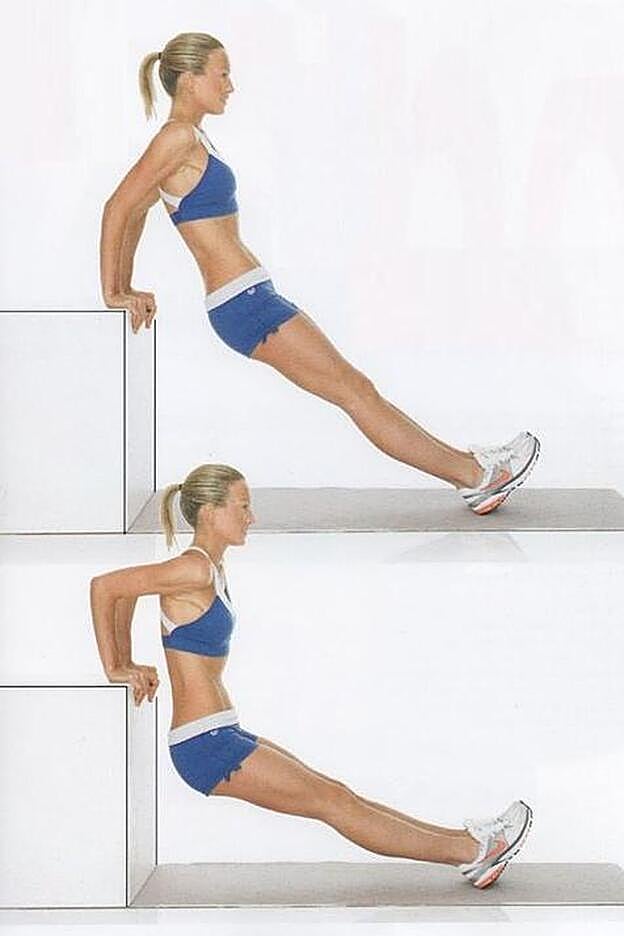 Para hacer el ejercicio pon una silla detrás de ti y lleva tus piernas estiradas hacia adelante apoyadas en los talones mientras tienes las manos apoyadas en el borde de la silla. Baja los glúteos flexionando codos como si quisieras sentarte en el suelo. Sube de nuevo el cuerpo poniendo toda la fuerza en los brazos. Repite el ejercicio 10 veces.