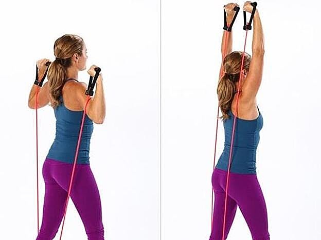 Necesitarás una banda elástica. Coge con una mano un extremo de la banda y con la otra el otro extremo. Písala con ambos pies separados del ancho de las caderas y estira tus brazos hacia arriba estirando la goma con fuerza en un movimiento controlado. Repítelo 10 veces. Este ejercicio fortalecerá mucho tus tríceps y te desharás de las llamadas ‘alas de murciélago en un abrir o cerrar de ojos.