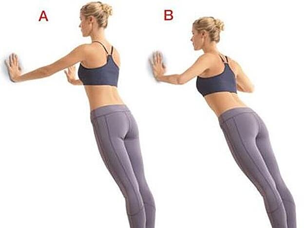 Ponte de frente a la pared, con los pies a un metro más o menos de distancia, y apoya las palmas de las manos sobre ella, separadas un poco más que la separación entre los hombros. Flexiona los codos llevando el pecho hacia la pared y después estira tus brazos. Realiza el ejercicio 10 veces.