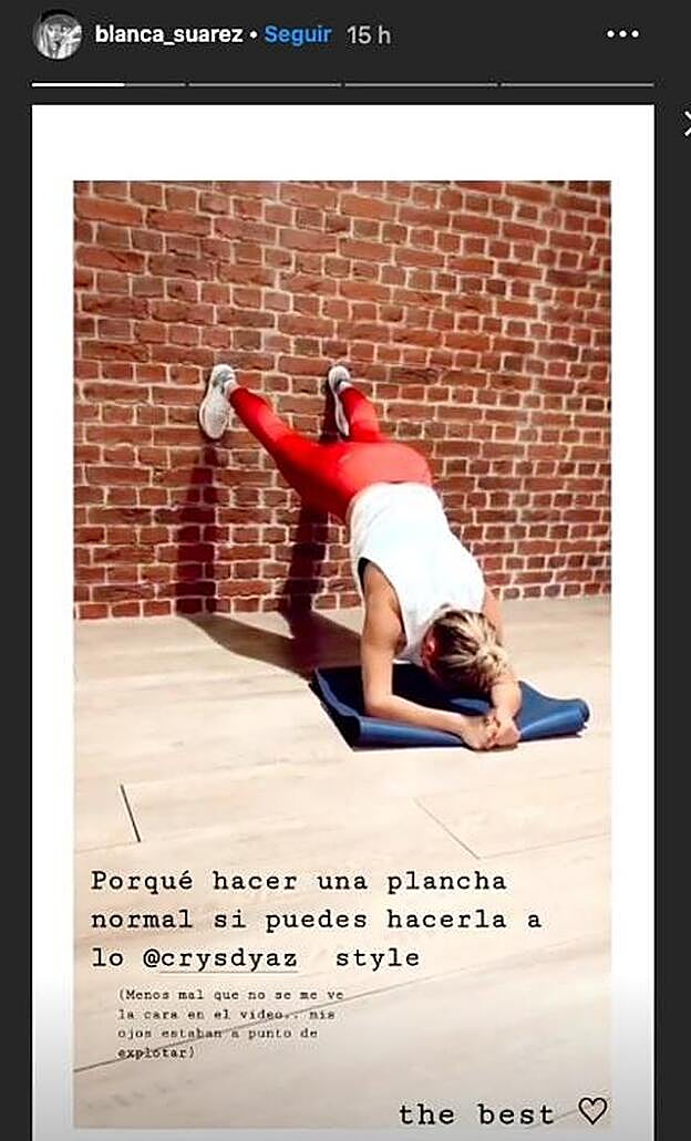 Y así lo comprobamos con esta story que subió Blanca Suárez a su cuenta de Instagram. En ella aparece haciendo una plancha, pero de una manera poco convencional: en vez mantener el cuerpo en el suelo, la actriz eleva las piernas para apoyarlas contra la pared.