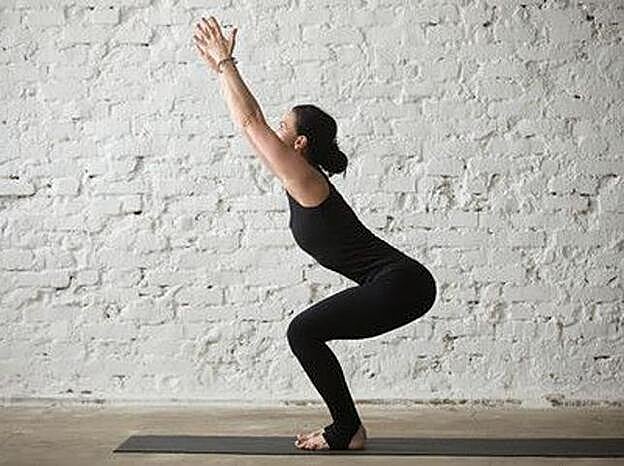 Quédate de pie con los pies juntos, báscula la pelvis y deja la espalda recta con los hombros lo más alejados posible de los oídos. Coge aire y lleva los dos brazos hacia arriba y junta las palmas de las manos. Suelta el aire y comienza a flexional tus rodillas llevando hacia atrás la cadera de la misma manera que harías para sentarte en una silla. Baja como si fueras a sentarte en esa silla imaginaria y mantén esa postura 10 respiraciones.