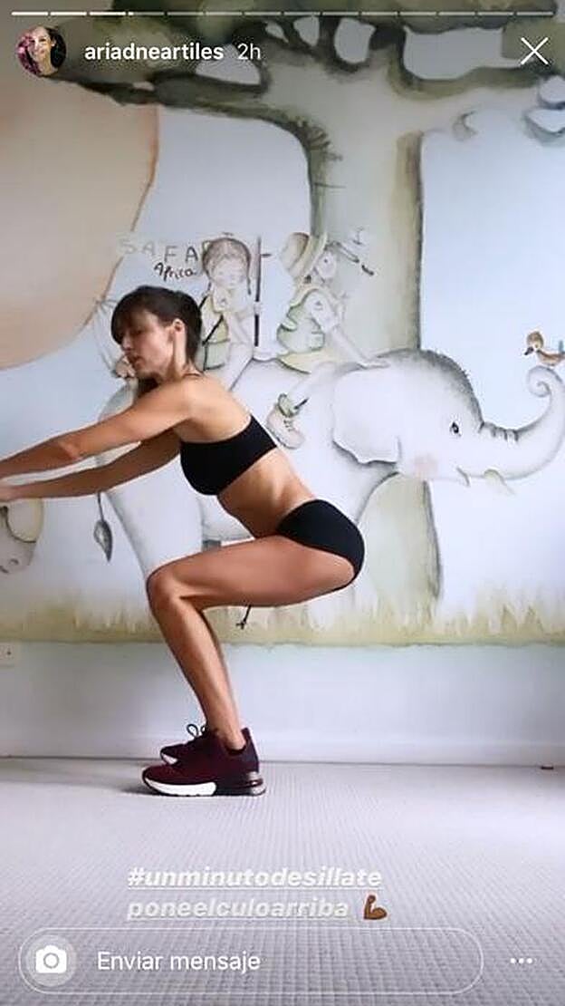 El primer ejercicio es realizar una sentadilla y mantenerla durante un minuto sin nigún apoyo. El truco es sentir que los isquiones tiran hacia abajo, como si estuvieras sentada en una silla. La modelo aconseja hacer el ejercicio con los brazos hacia arriba, pues para ella es más cómodo, pero también se pueden poner cruzados delante del pecho, uno sobre otro. El reto que lanza la actriz es bajo este hashtag #unminutodesillateponeelculoarriba.