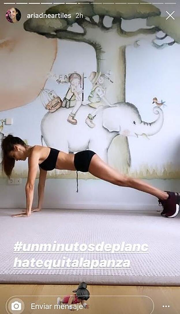 El segundo ejercicio es una plancha, ejercicio que se realiza apoyando las manos debajo de los hombros y poniendo culo y abdomen bien firme. En esa posición, también debemos aguantar un minuto. Es uno de los mejores ejercicios que existen para reducir tripa. El otro divertido hashtag con el que etiqueta este ejercicio Ariadne es #unminutodeplanchaquitalapanza.