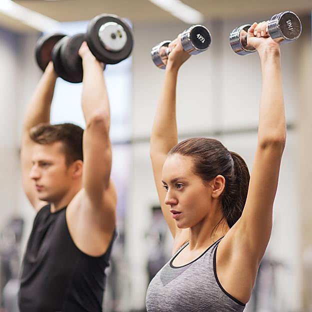 De pie: Coge las mancuernas y con los brazos extendidos longitudinalmente a los lados del cuerpo, eleva los brazos estirados hasta llegar a levantar el peso por encima de la cabeza y volver a la posición inicial. Este ejercicio se puede hacer con variaciones como hacerlo en dos tiempos (parando cuando las manos se encuentren a la altura del pecho) o incluso flexionando los brazos, con lo que también trabajaremos los músculos de los brazos.