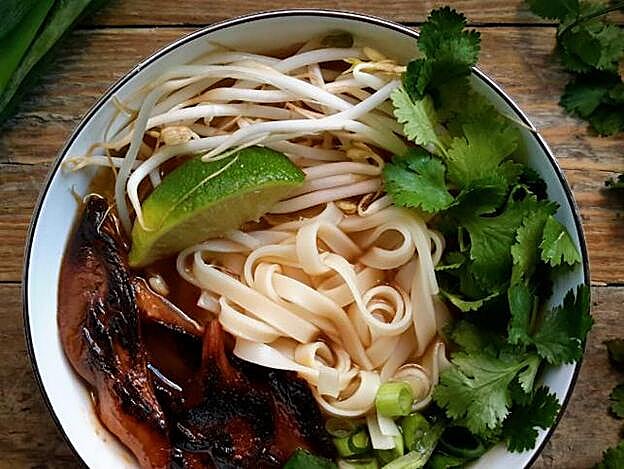 En una fuente grande o en platos pequeños individuales reparte los puñados de brotes de soja, las hojas de cilantro, las de menta, las de albahaca, las limas cortadas medias rodajas (para exprimir en la sopa) y la cebolleta picada. Sirve la sopa pho en boles grandes y que cada comensal elija qué guarnición agregarle y en qué cantidad. Ya tienes listo una deliciosa receta tradicional vietnamita que sorprenderá a tu paladar y al de tus invitados.