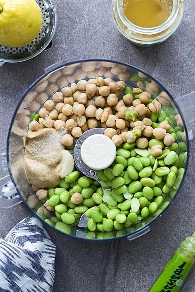 Elaboración: Si tu edamame es congelado puedes hacerlo al vapor durante unos 15 o 20 minutos o bien hervirlo directamente congelado en una olla con agua y sal aproximadamente 10 minutos. Espera a que se enfríen y desgrana si tenías el producto en vainas. Pon las habas con el resto de los ingredientes en un robot de cocina o batidora y tritura hasta obtener una mezcla homogénea. Acompaña tu hummus de edamame con crudités y sírvelo con un chorrito de aceite de oliva por encima y un poco de sésamo. ¡Enjoy!