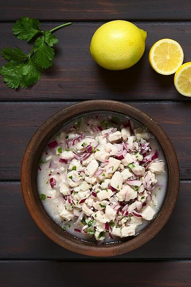 Limpiamos y troceamos el pescado previamente congelado (por el anisakis) y reservamos. Lo ponemos en un bol con agua y hielo para que se mantenga fresco y aderezamos con sal, pimienta y chile. Cortamos la cebolla en juliana, exprimimos las 6 limas y añadimos el zumo al pescado, que se cocinará con los jugos cítricos, por loq ue se tendría que ir poniendo blanco poco a poco. Removemos bien, quitamos el agua sobrante, dejamos reposar 10 minutos en el frigorífico. Rectificamos de sal y añadimos la cebolla y el cinlantro picado.