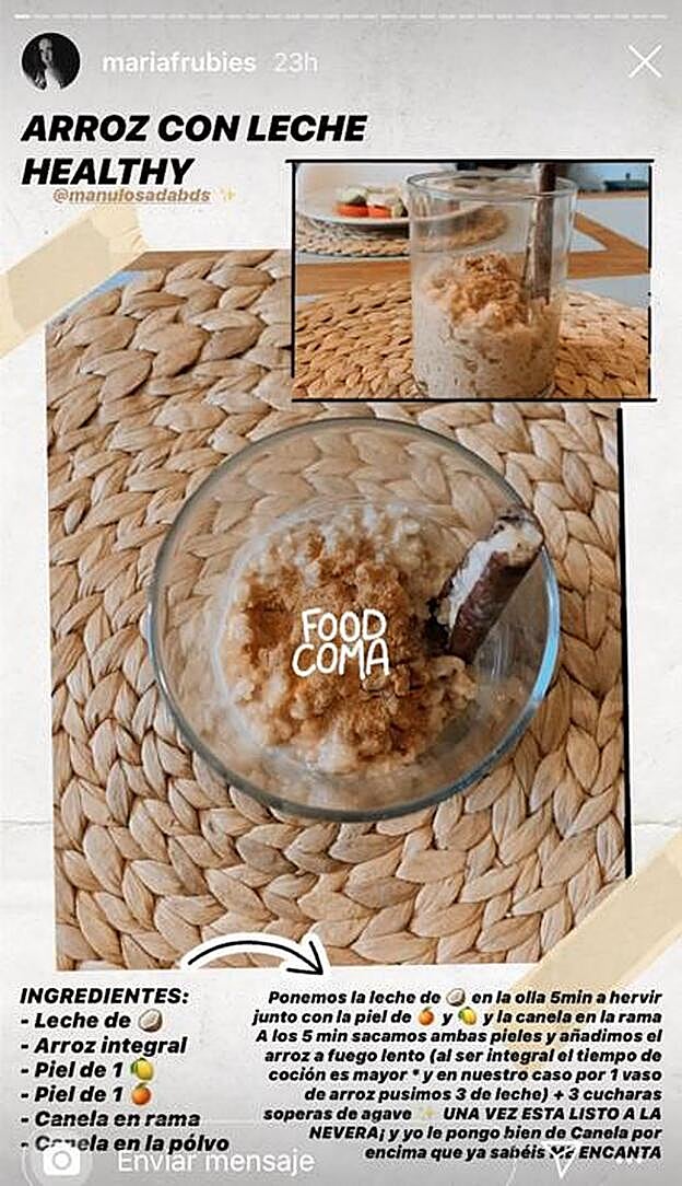 A lo largo de estas semanas de confinamiento hemos visto como María Fernández-Rubíes nos compartía muchas recetas en su perfil de instagram y la verdad es que todas ellas tienen una pinta buenísima. Y lo mejor es que todas ellas son saludables. En una de sus últimas Instagram stories la influencer compartía la receta de un postre tradicional buenísimo y saludable: el arroz con leche en su versión healthy.