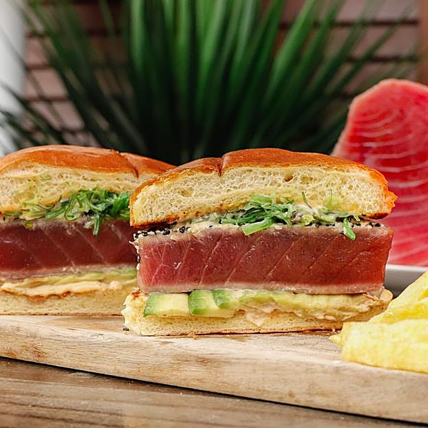 Dentro del pan brioche al atún lo acompañan aguacate, algas wakame, mayonesa de sriracha y pepinillo. Una receta fresca y con un punto picante que es ideal para comer en los meses más calurosos o cuando queremos disfrutar de este delicioso pescado de una forma diferente. Llega acompañado de unas patatas fritas y también está disponible en delivery y take away.