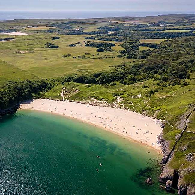 Barafundle Bay es un tesoro escondido. No hay carretera directa ni aparcamiento en la arena y para llegar a ella, hay que caminar unos 20 minutos para llegar a ella desde el aparcamiento de Stackpole Quay, atravesando prados verdes y dunas que parecen sacados de una postal. Tras el paseo para llegar a esta cala secreta en la costa galesa, el esfuerzo se ve recompensado con una vista de ensueño: unos acantilados cubiertos de vegetación envuelven un arco de arena fina que da paso a un mar de aguas turquesas y transparentes.