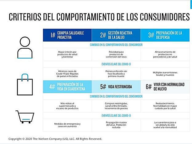 Según la compañía global de medición y análisis de datos Nielsen “esta evolución del comportamiento se puede identificar con seis estadios o niveles. Los dos primeros tendrían que ver con la salud. En el primero compramos productos vinculados a salud de manera proactiva que nos ayuden a sentirnos bien y seguros de nuestro estado de salud. Y, en el segundo, pasamos a un modo reactivo conforme nuestro grado de preocupación se incrementa, lo que se traduce en comprar desinfectantes, alcoholes y productos más específicos para gestionar la situación a la que nos enfrentamos” esto lo hemos visto claramente en esas compras obsesivas de los primeros días, pero Nielsen explica dos niveles más que se han dado ya en España “ya en un tercer estadio empezamos a abastecer la despensa haciendo compras algo más grandes y es en el cuarto nivel, en el que nos encontramos en España, en el que entra la cesta de confinamiento que puede fácilmente doblar el tamaño de una compra habitual.”