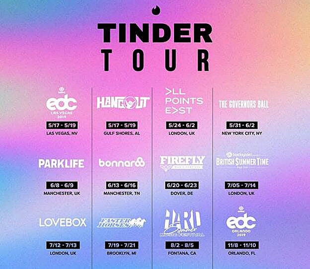 Por ahora, el servicio está disponible desde el 1 de mayo y solo para eventos en Reino Unido o Estados Unidos, porque Tinder tiene acuerdos con las productoras de AEG Worldwide y Live Nation. En concreto podrás activarlo si vas a los siguientes festivales: EDC Las Vegas y Orlando, Governors Ball, Hangout, Bonnaroo, Faster Horses, Hard Summer, Firefly, Parklife, All Points East y British Summer Time.